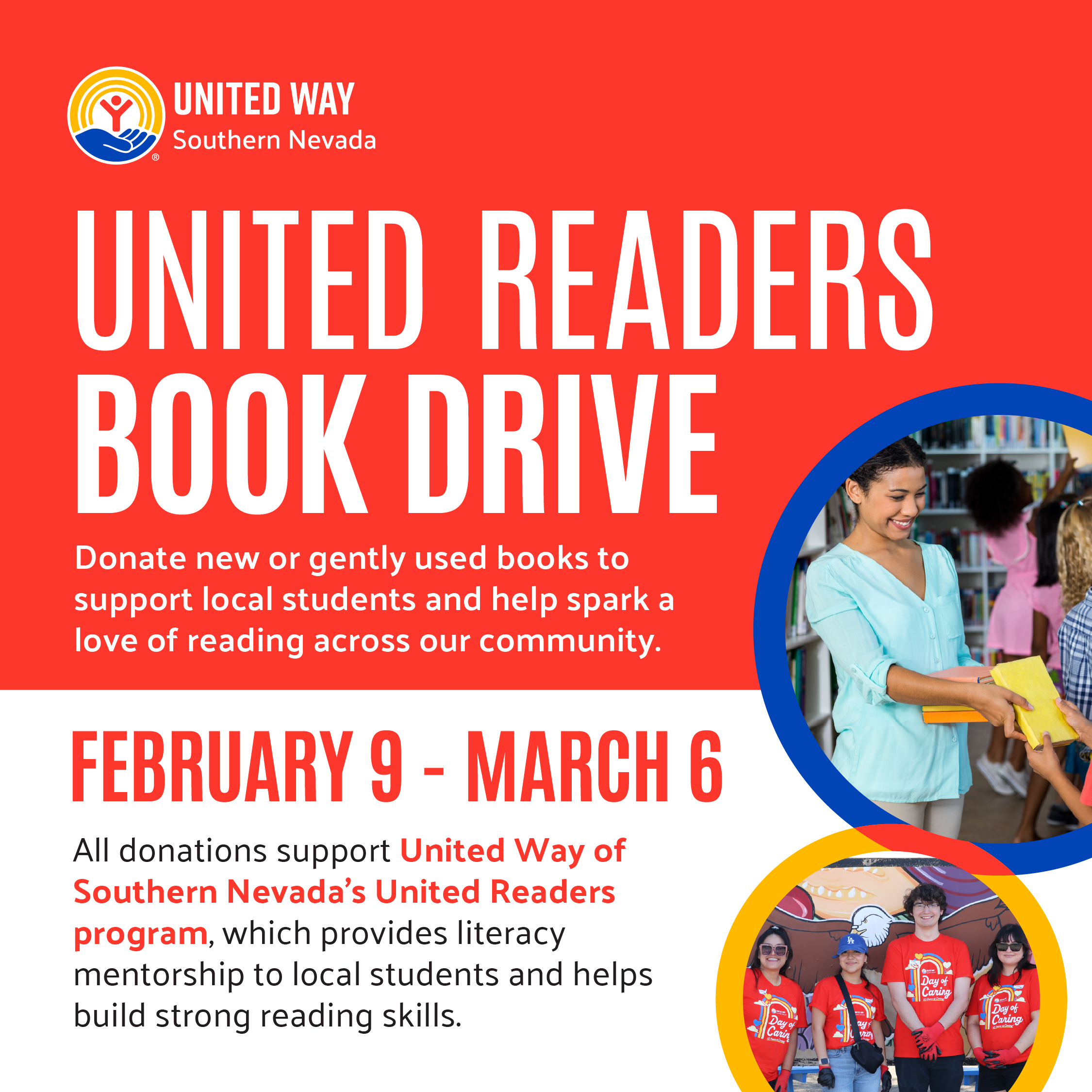 From February 9 to March 6, United Way of Southern Nevada invites you to help spark a love of reading by donating new or gently used books for local students. Your support fuels our United Readers program, which provides literacy mentorship and builds strong reading skills for K-5 students across our community.