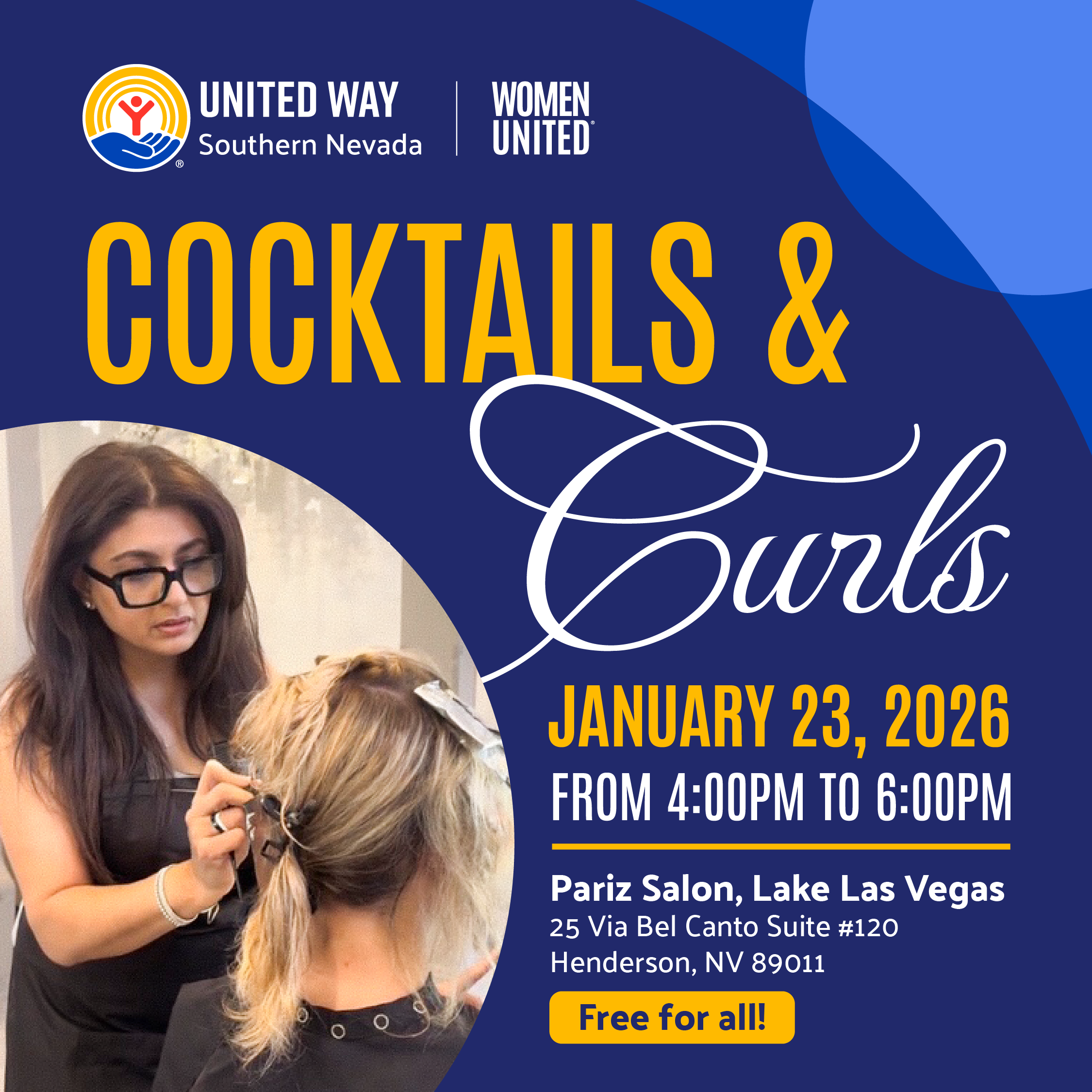 Join Women United for a fun and fabulous evening at Cocktails & Curls, hosted at the beautiful Pariz Salon in Lake Las Vegas! Bring your favorite styling tools and enjoy hands-on tutorials from professional stylists to help you look and feel your best.